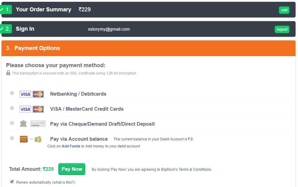 Step 4 : Next Page Open है. यहाँ Apply coupon में हम इस JANCOM99AFF कोड को डालेंगे जिससे डोमेन हमें 99 रूपये में मिल जायेगा : JANCOM99AFF (कई बार कोड Apply नहीं होता ऐसे में हम पहले Bigrock पर ID बनाएंगे )
